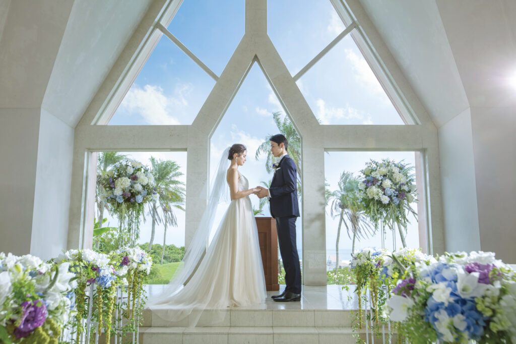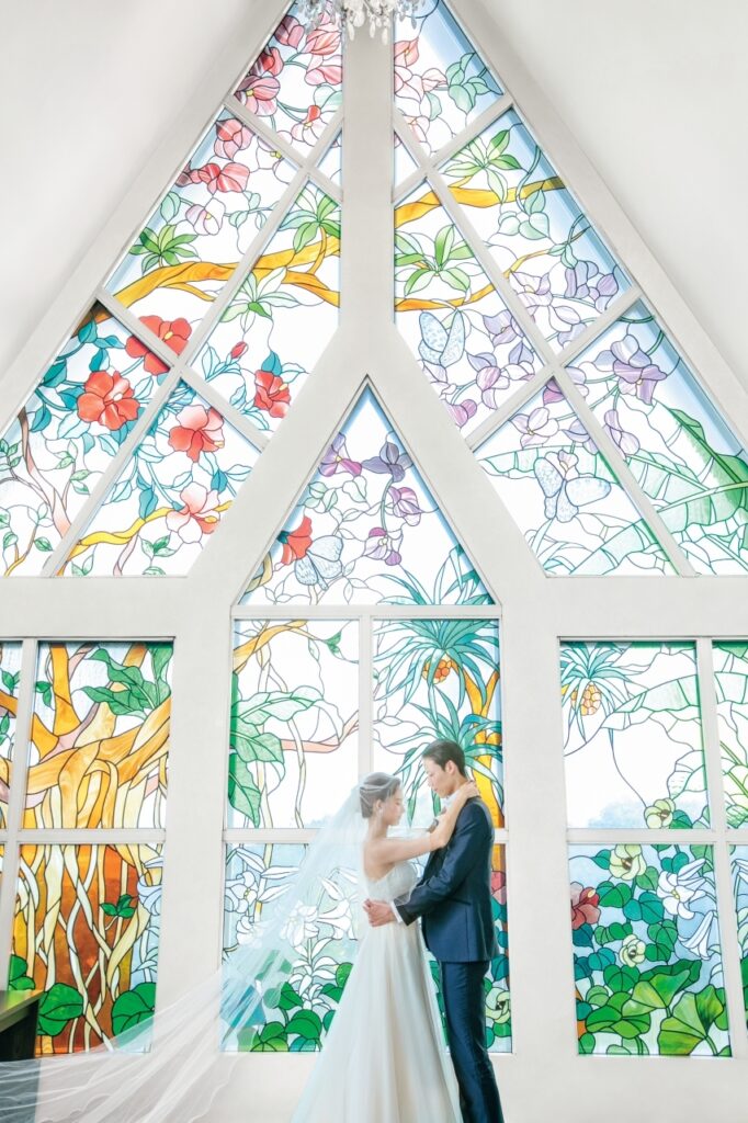 在宮古島的植物圖案彩繪玻璃的見證下,您可以實現無與倫比的豪華婚禮。