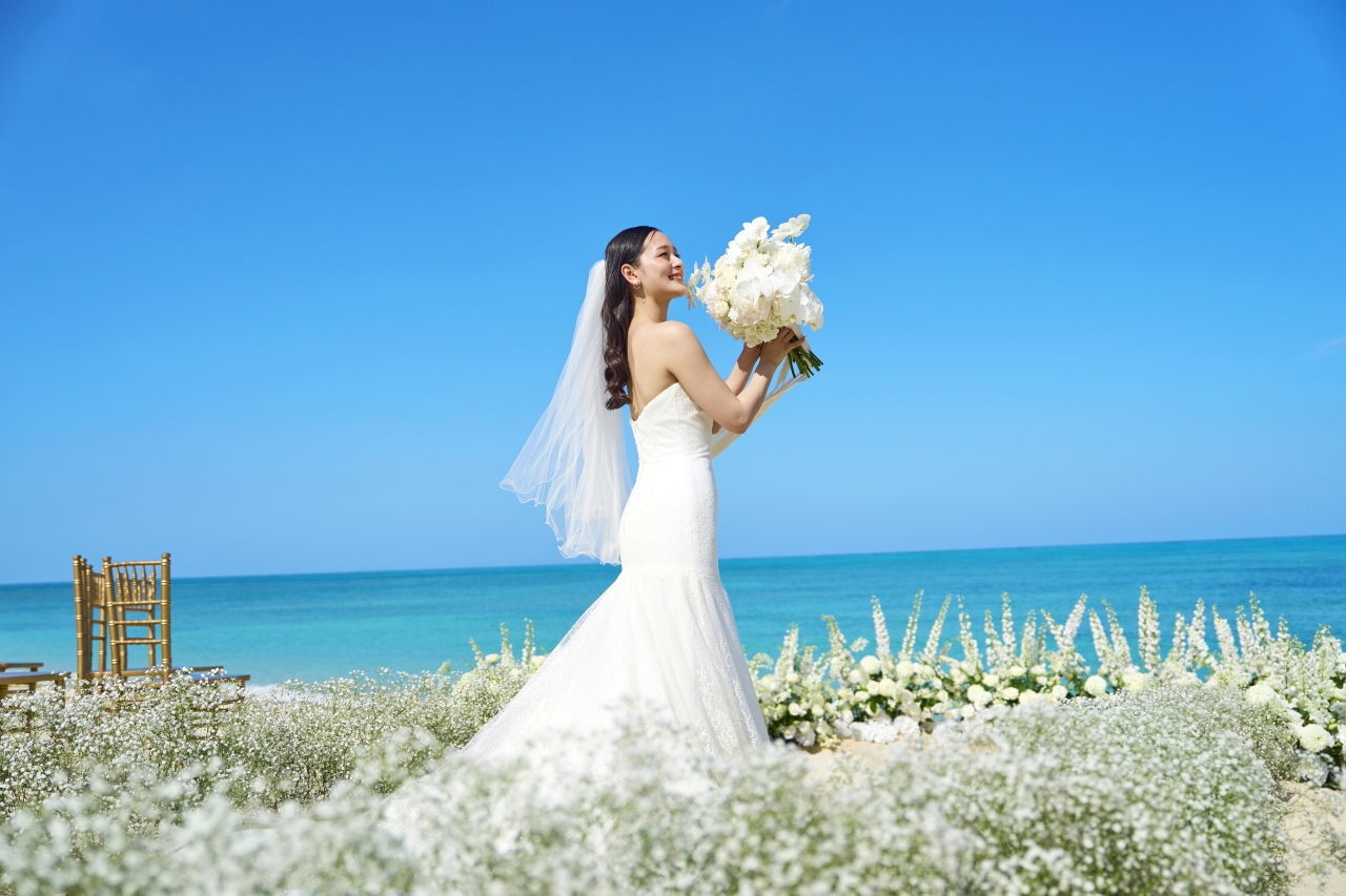 迎著徐徐的海風、踩在細膩柔軟的白沙上,與眼前無邊際的海洋和天空一同作為誓言的見證。當新娘踏著沙灘走向新郎,背景是閃耀的藍與白,這樣的畫面,不需要任何多餘的裝飾,便足以讓人屏息。這場婚禮不只是對愛情的承諾,更像是與自然融為一體的神聖儀式。