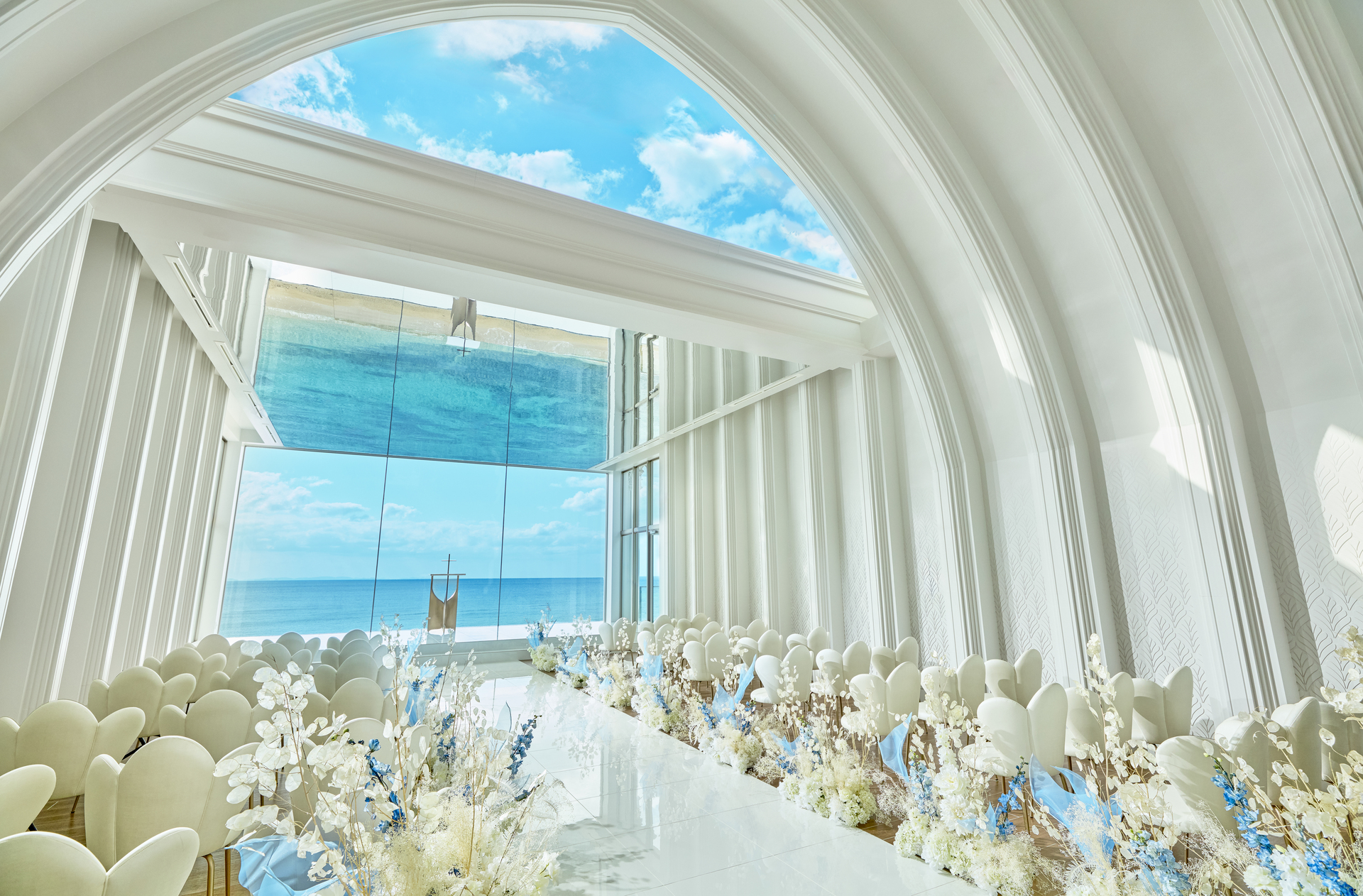 從高挑的天井灑落而下的光芒,照亮了這座純白色的教堂,成就了自然與建築美學交織的唯一無二的舞台。彷彿引導新人邁向蔚藍世界的宏偉拱門,象徵著兩位攜手至今,以及從此刻開始的未來。在這裡,將實現如同現代藝術般高雅、光彩煥發的婚禮儀式。